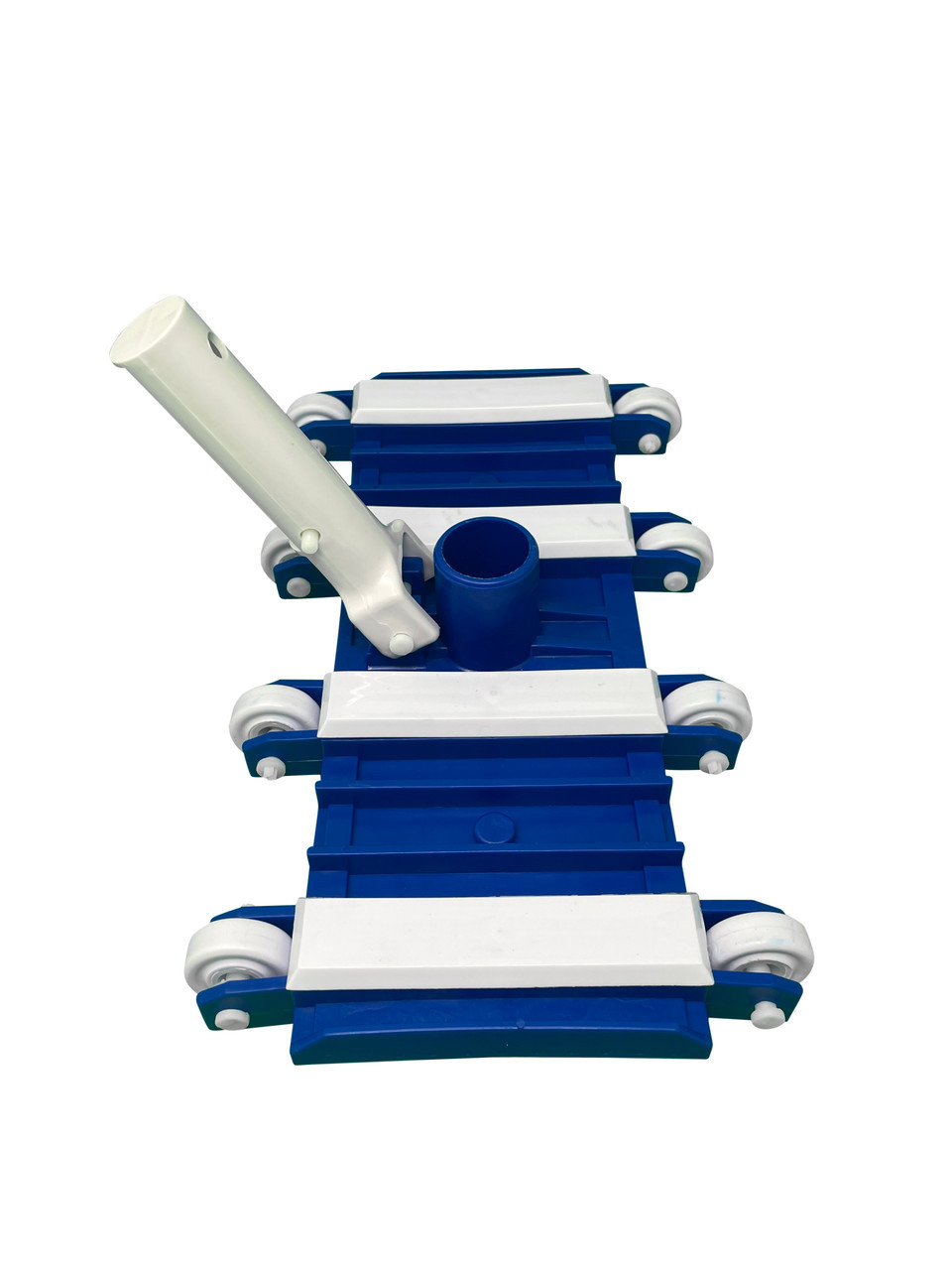 Tête d’aspirateur flexible pour piscines creusées. Cet accessoire d’aspiration peut être utilisé avec tout manche télescopique standard. La tête d’aspirateur utilise le mouvement des roues pour guider facilement votre aspirateur autour de la piscine.