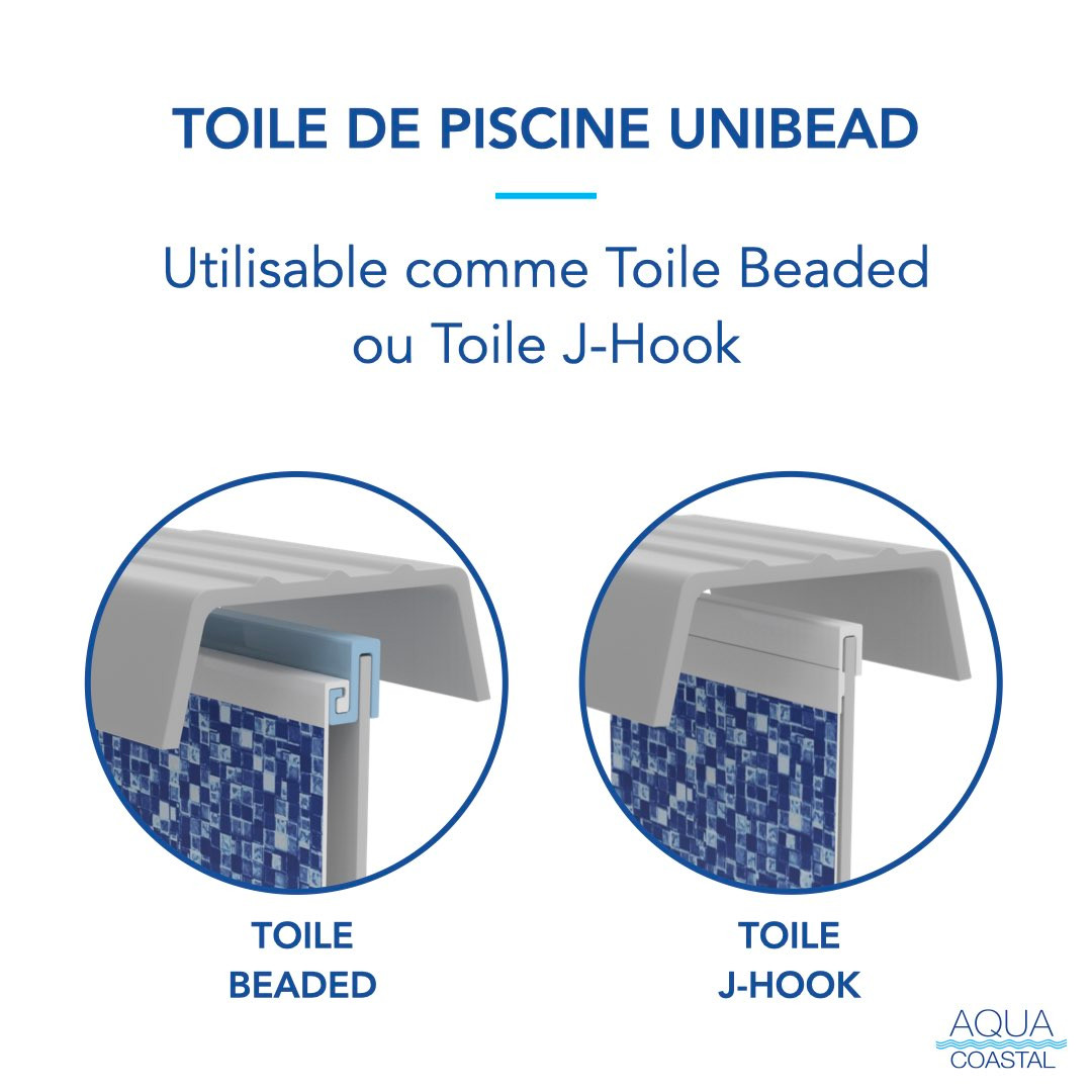 Les toiles Unibead sont conçues pour correspondre exactement à la hauteur de paroi de votre piscine. Elles peuvent être utilisées comme toile J-hook / J-bead, ou encore avec un récepteur de bordure comme toile à bordure standard. Faciles à installer, elles conviennent parfaitement aux personnes incertaines du type de bordure qu’elles possèdent.