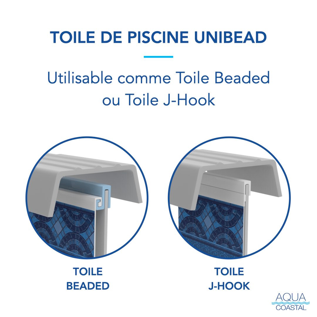 Les toiles Unibead sont conçues pour correspondre exactement à la hauteur de paroi de votre piscine. Utilisez-les comme toile J-hook / J-bead, ou avec un récepteur de bordure comme toile à bordure standard!
