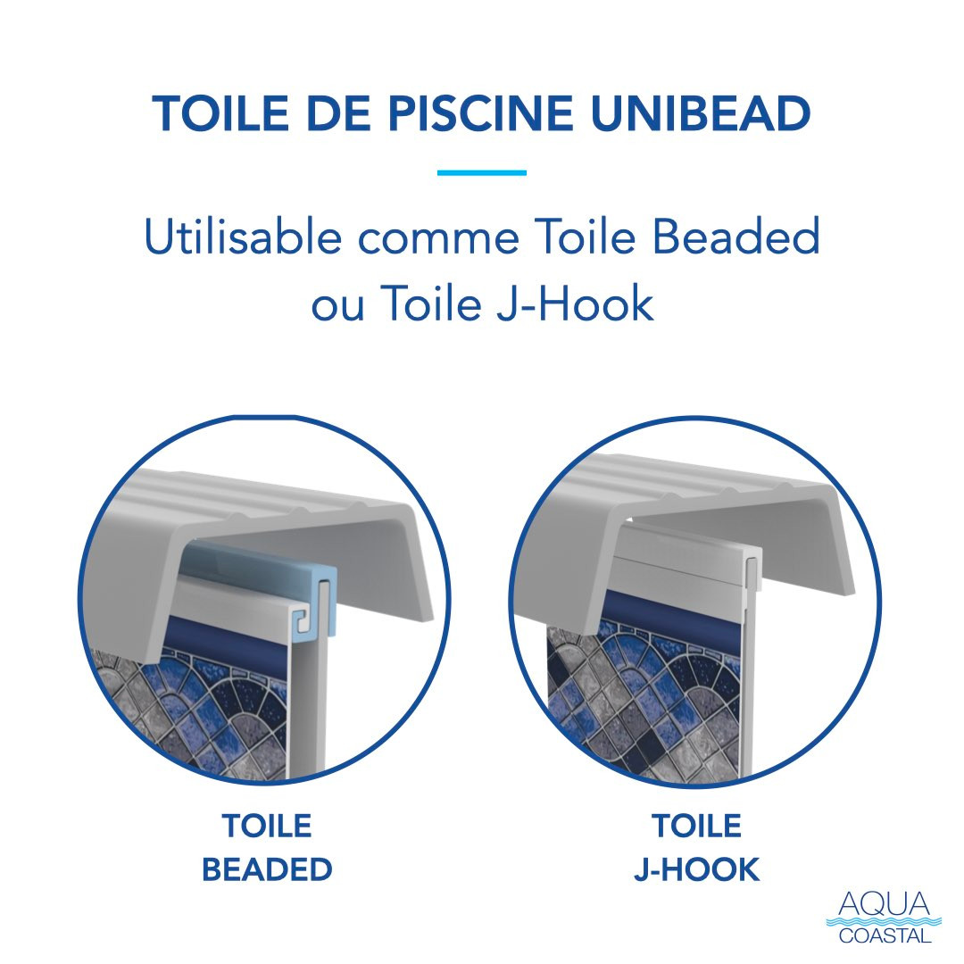 Les toiles Unibead sont conçues pour correspondre exactement à la hauteur de paroi de votre piscine. Utilisez-les comme toile J-hook / J-bead, ou avec un récepteur de bordure comme toile à bordure standard!