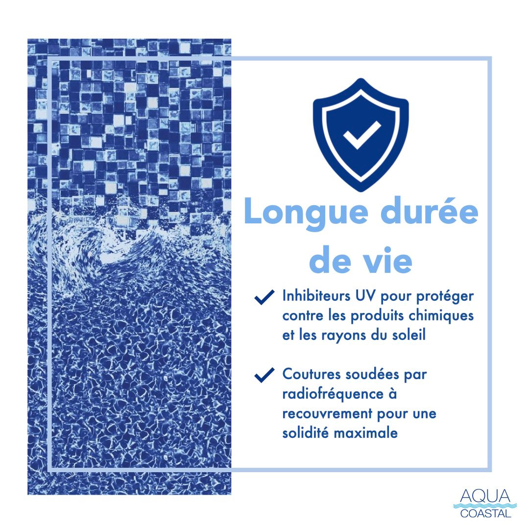 • Installation polyvalente : Dotée d’un rebord Unibead polyvalent, elle peut être installée comme toile à crochet (J-hook) ou avec un rail à jonc (bead receiver), s’adaptant facilement à la configuration de votre piscine